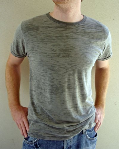 50% ringspun cotton, 50% polyester; garment-dyed, enzyme/silicone finish; extensively weathered, sheer fabric for vintage look; one-of-a-kind pilling and striation so no two shirts look the same; 1x1 burnout rib collar; shoulder-to-shoulder neck tape; blindstitching on bottom hem and sleeves; sideseamed; set-in sleeves; perfect fit.